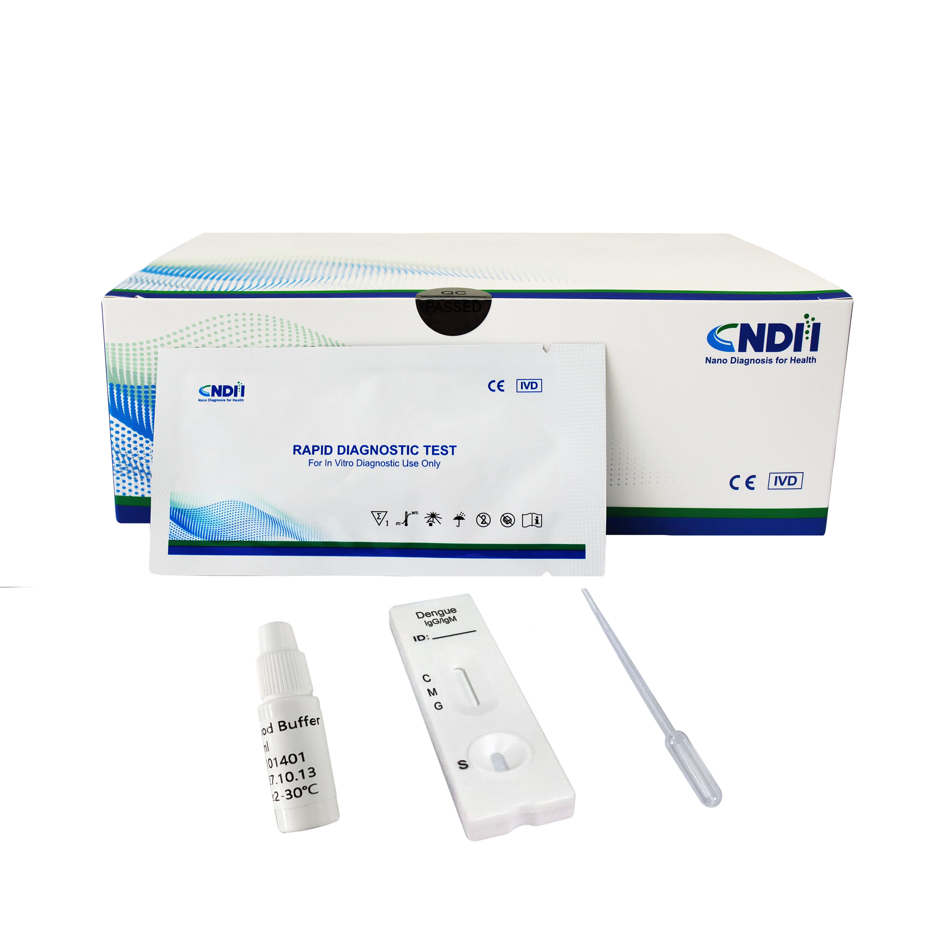 The Dengue IgG/IgM Rapid Test is a lateral flow chromatographic immunoassay for the qualitative detection of antibodies (IgG and IgM) to dengue virus in human Whole Blood/Serum/Plasma. It provides an aid in the diagnosis of infection with Dengue viruses.